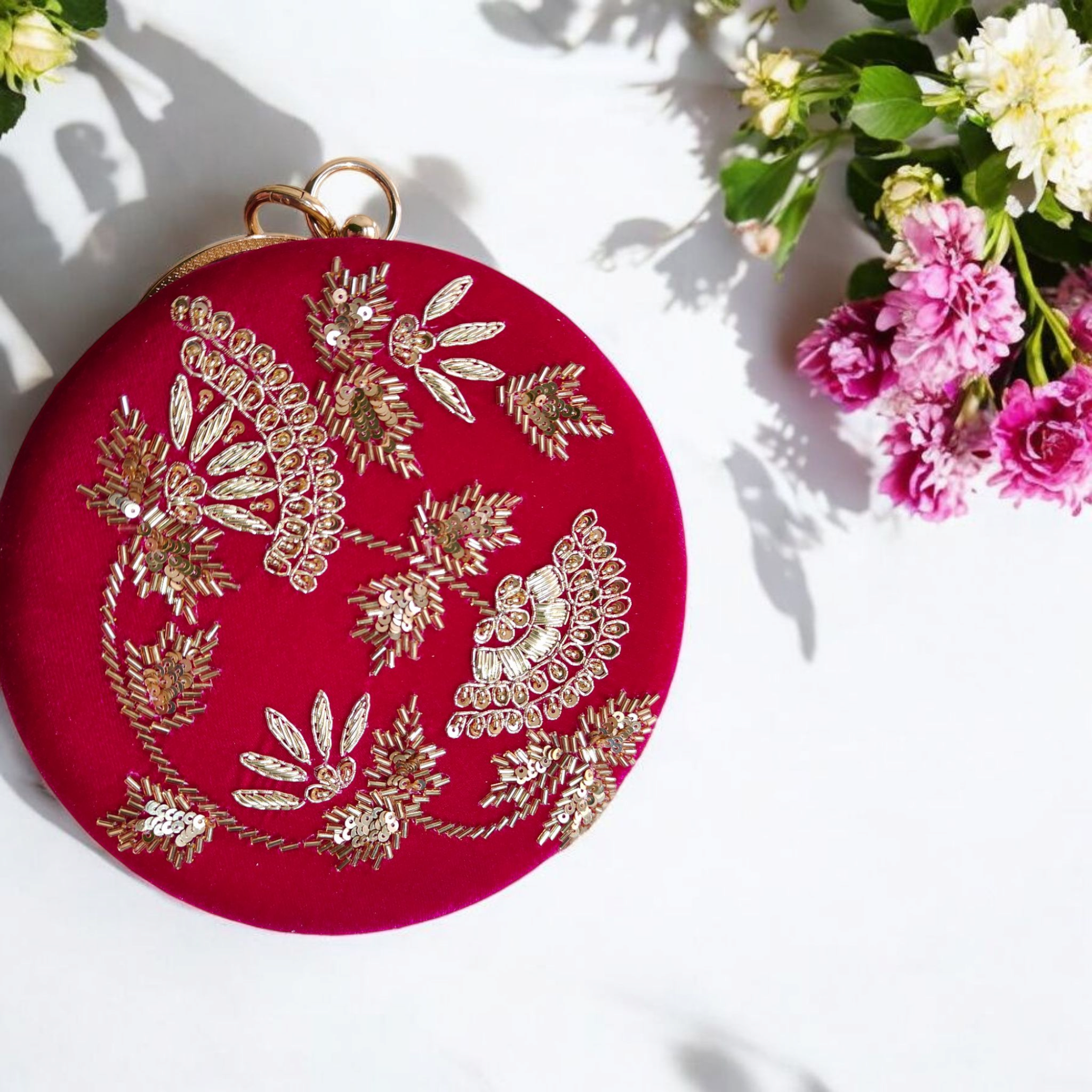 Add a pop of royal charm to your look with Classy Sole’s exquisite round magenta clutch. Crafted from plush velvet in a deep magenta hue, this stunning accessory is intricately hand-embroidered with golden zari and sequin work in elegant floral and fan motifs. The elegant gold ring handle offers both style and convenience, making it easy to carry with grace. Whether you’re attending a wedding, a festive celebration, or an evening soirée, this clutch brings just the right balance of tradition and trend to your ensemble.