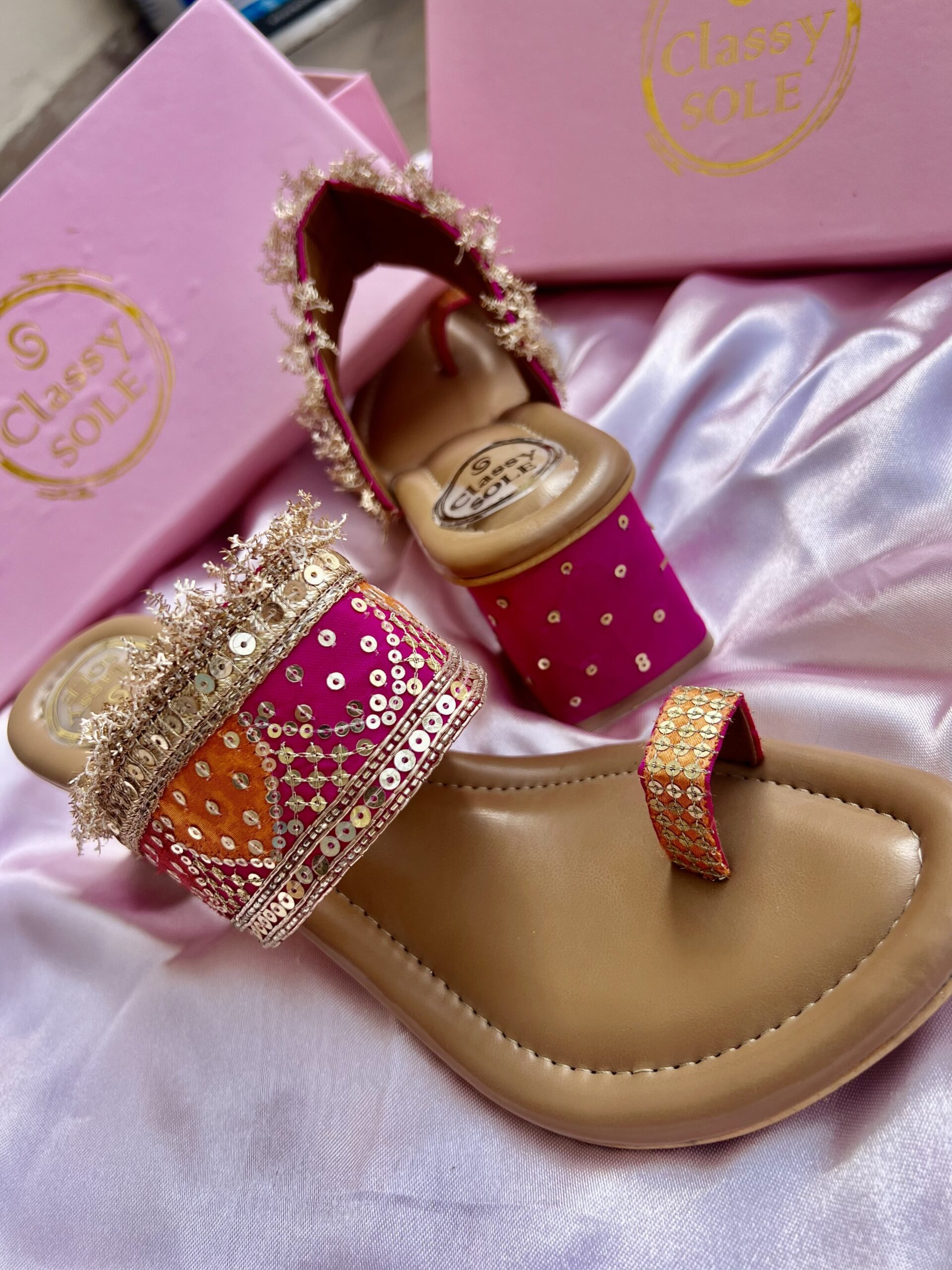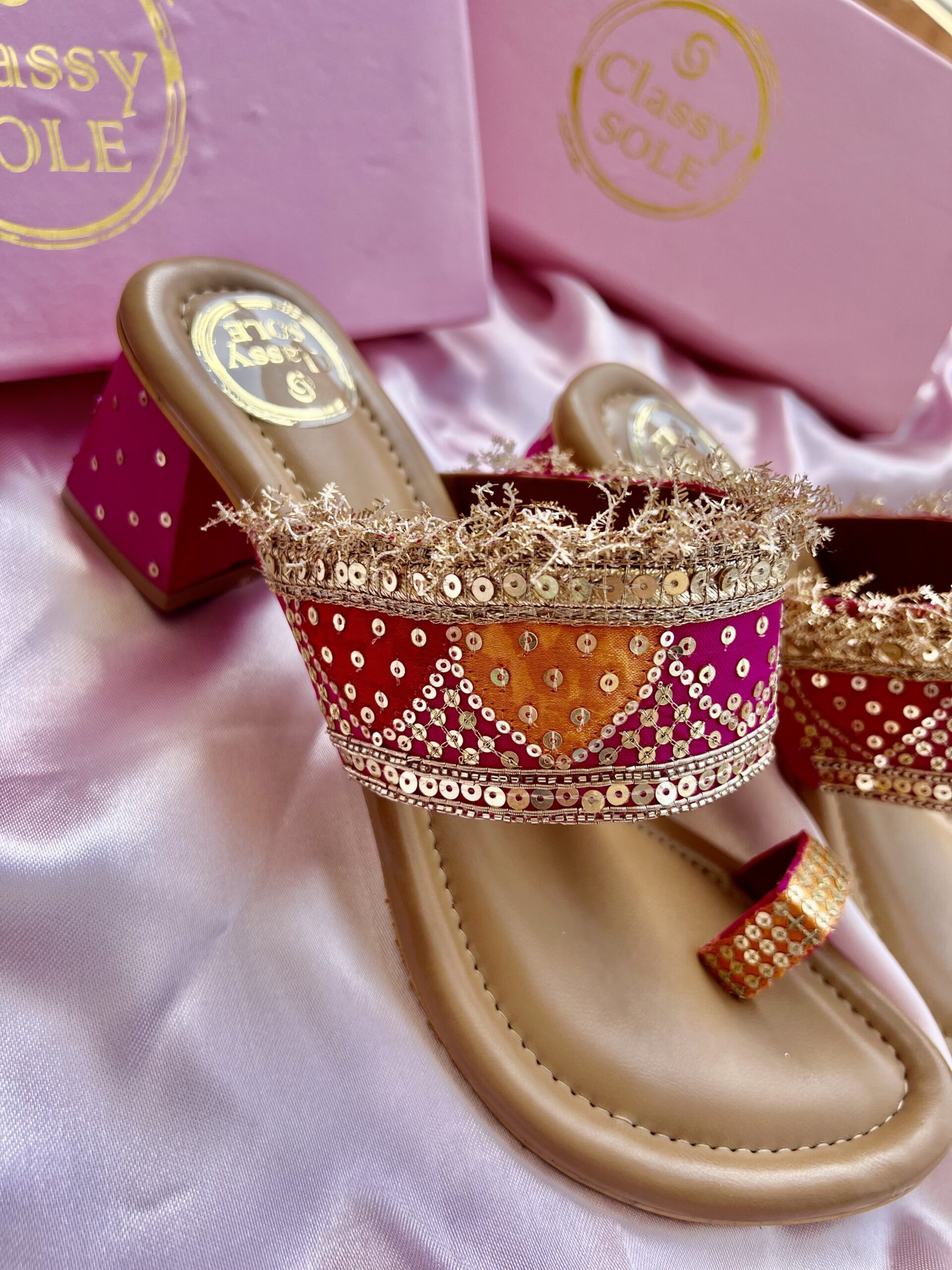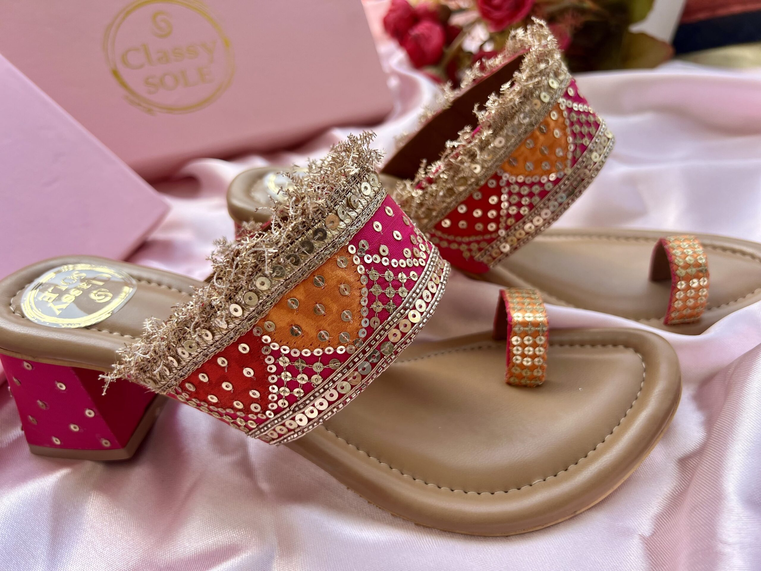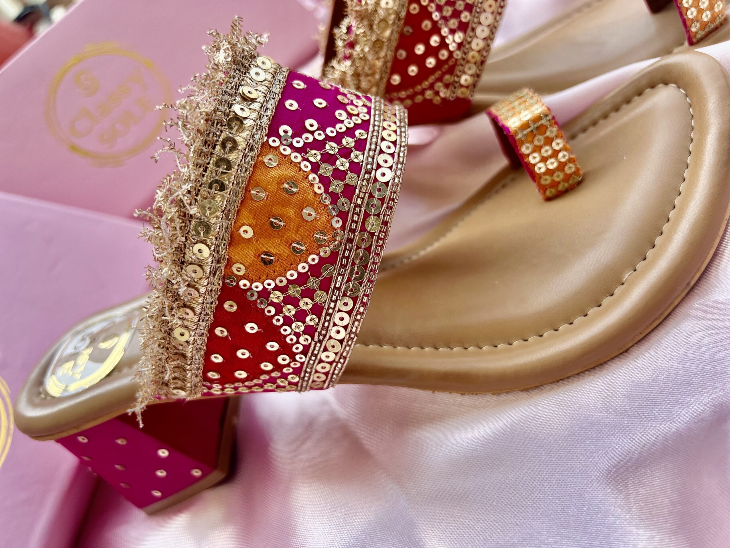 Discover the perfect blend of tradition and modernity with our stunning Magenta and Orange Kohlapuri Heels. Handcrafted to perfection, these heels are a vibrant addition to any wardrobe, designed to make you stand out with every step.