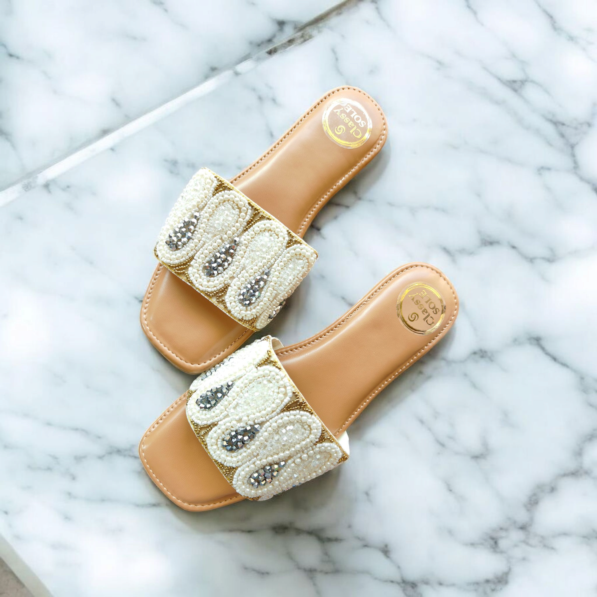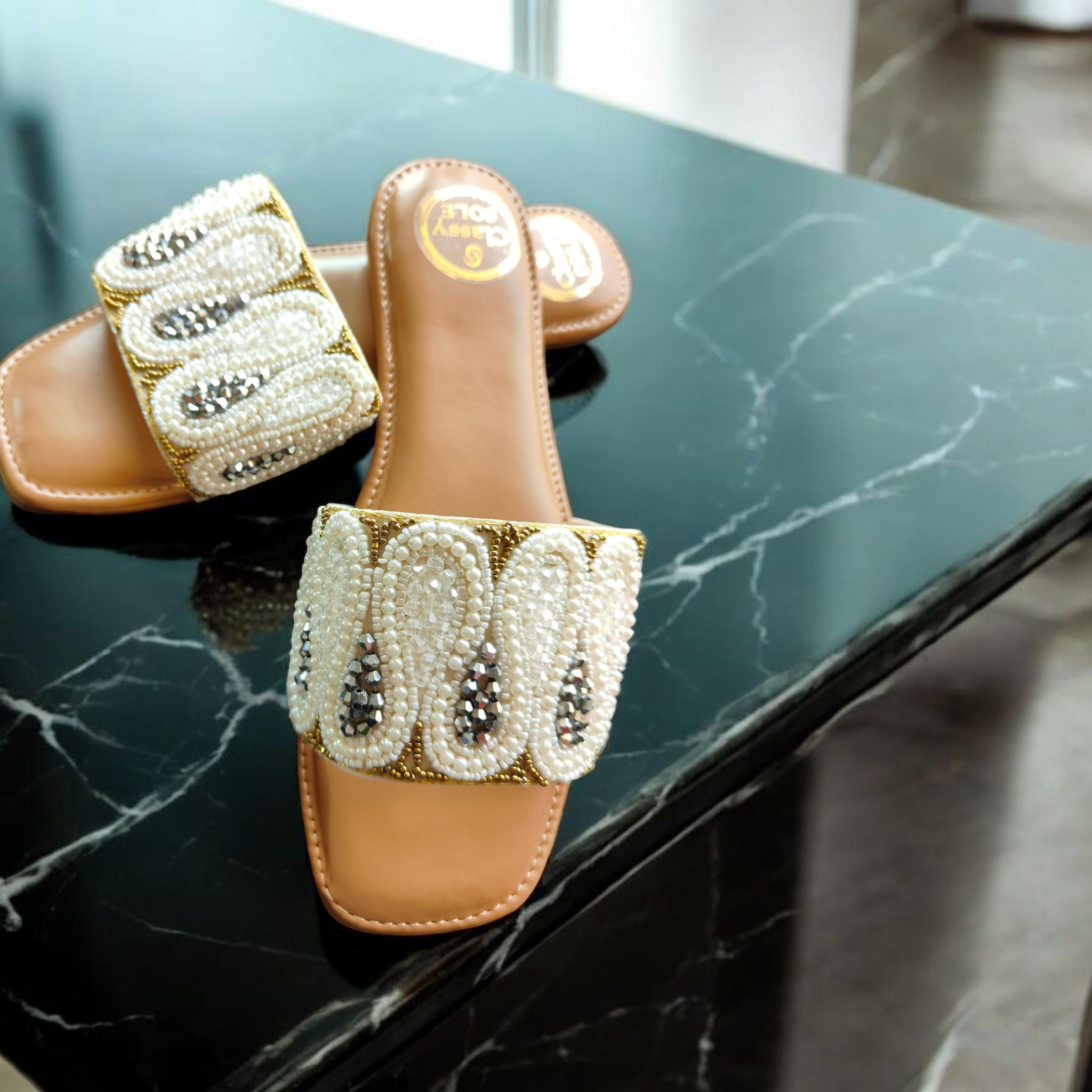 Turn heads in Bella by Classy Sole — tan base flats featuring luxe pearl & sequin embroidery. Comfort meets elegance in this handcrafted must-have!