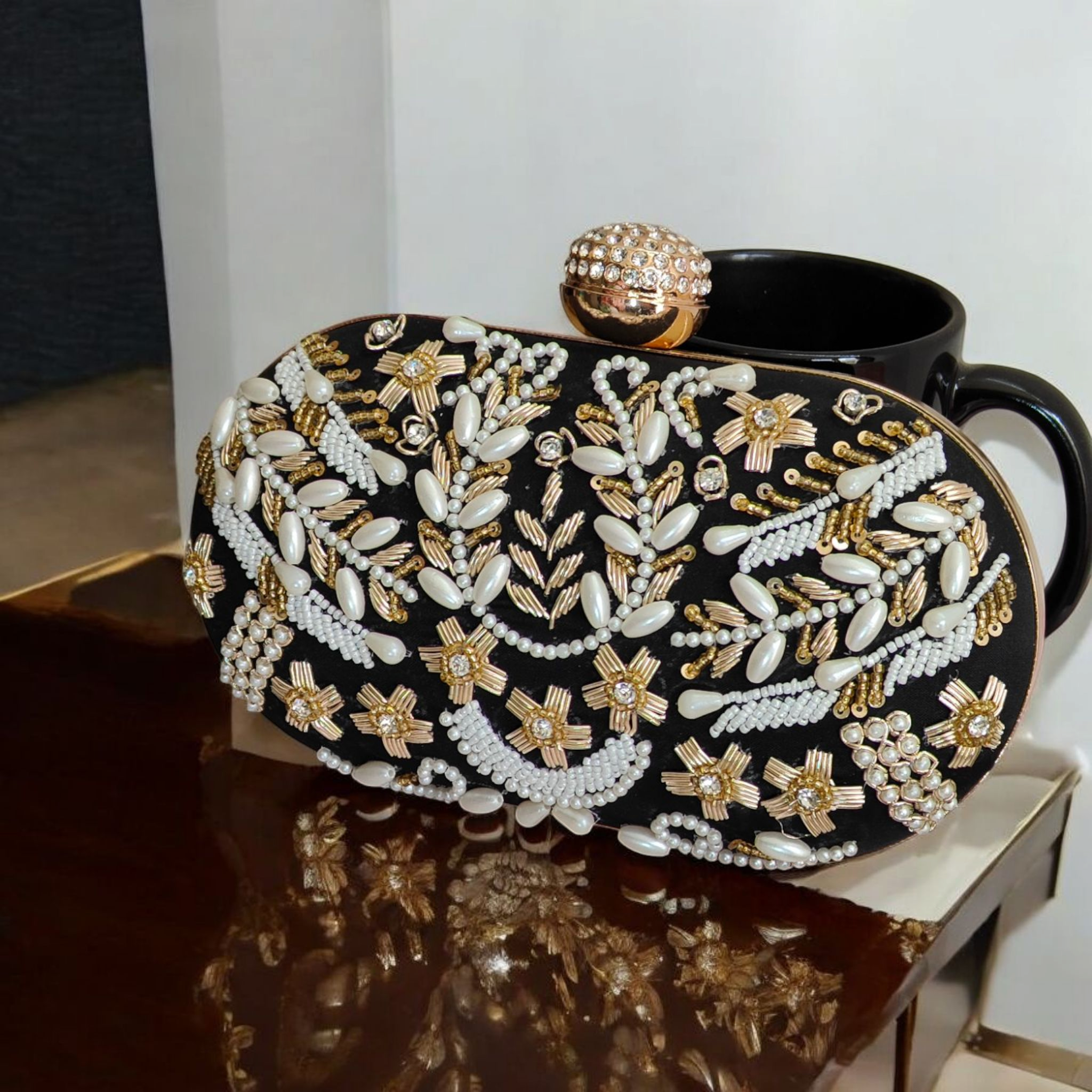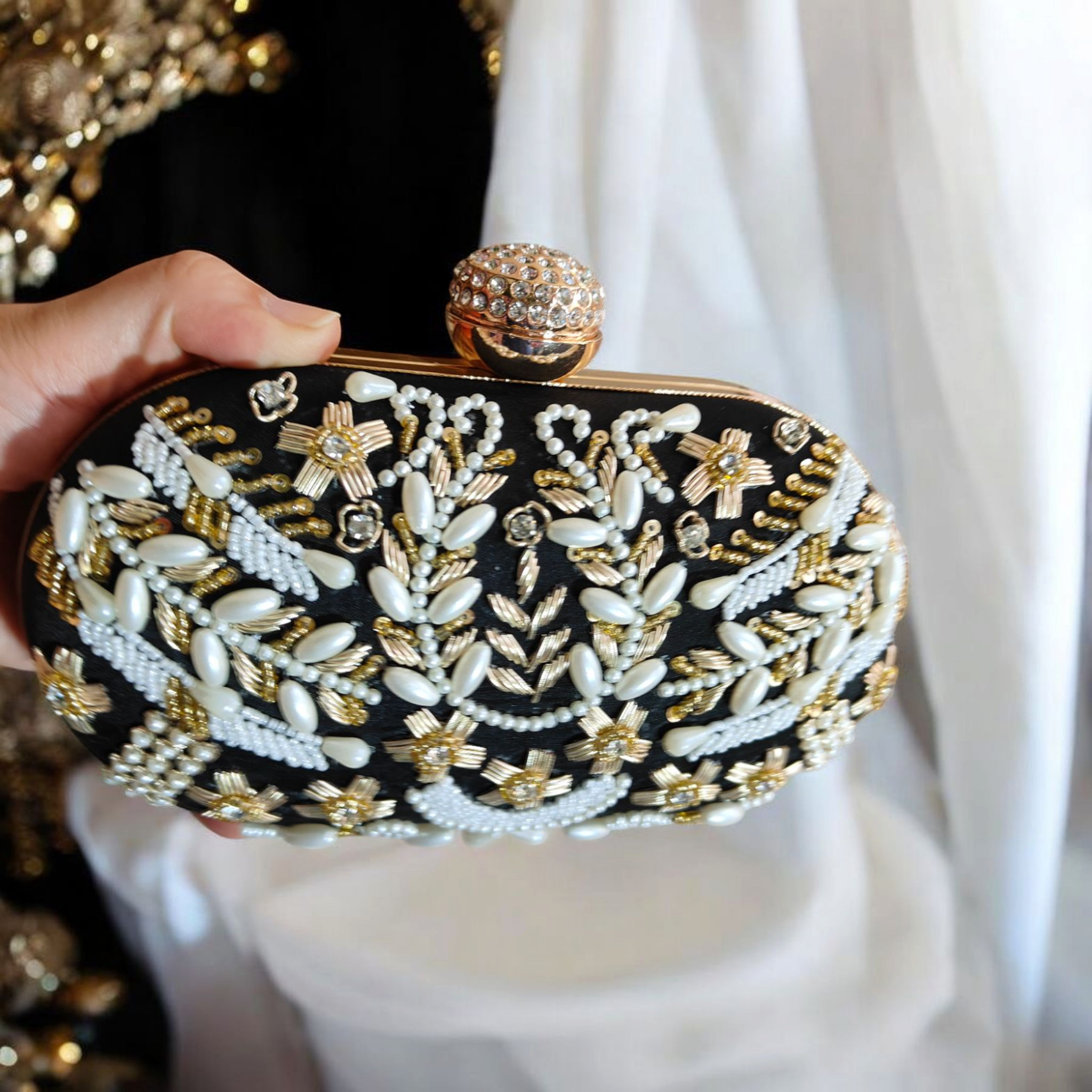 #ClassySole #LuxuryClutch #EveningGlam #BlackAndGold #StatementBag #PearlClutch #CrystalDetails #HandEmbroideredBag #GoldenEmbellishments #BeadedBeauty #WeddingStyle #PartyReady #FestiveAccessories #CocktailLook #GlamEssentials