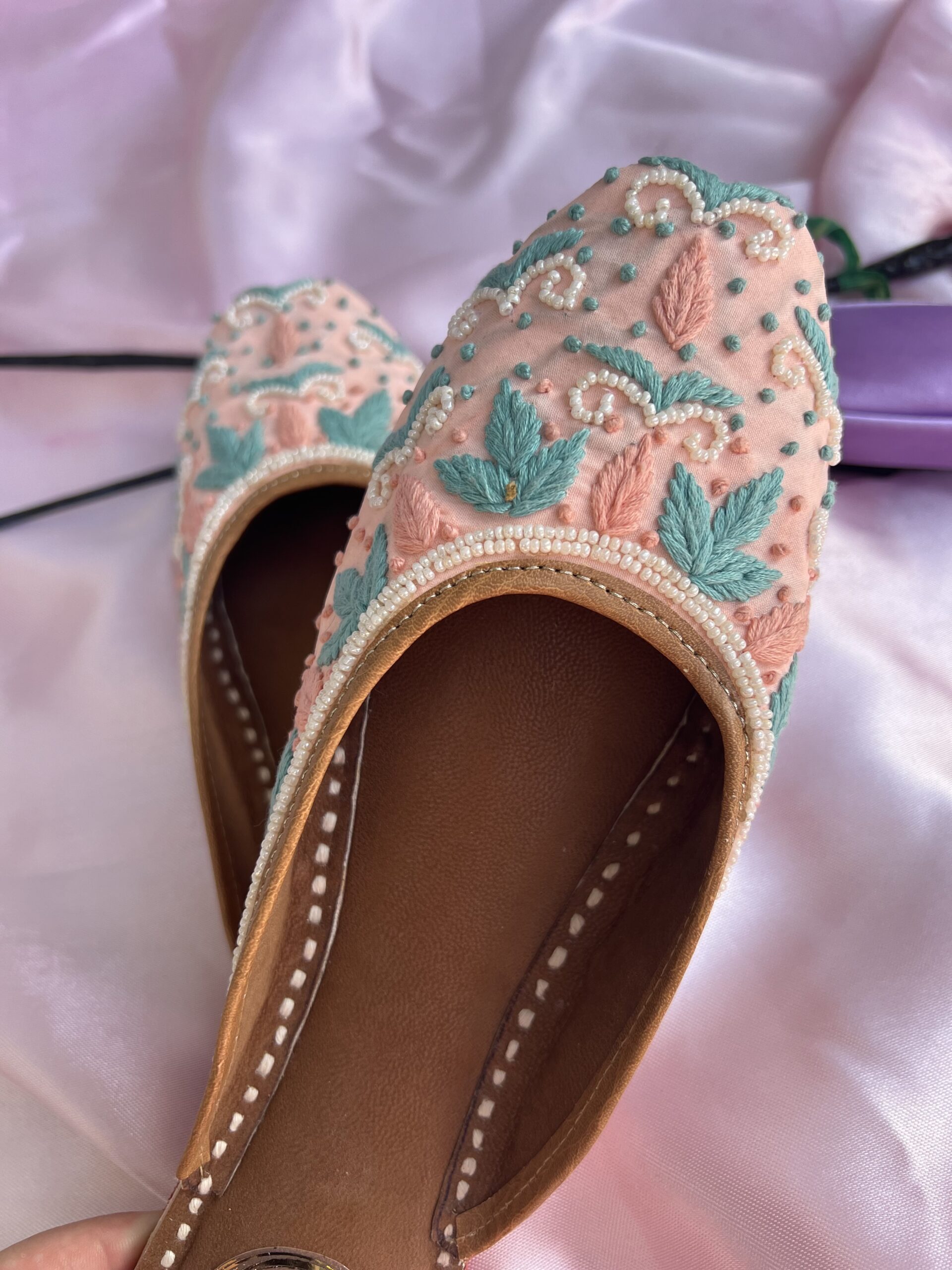Storage -Juttis are delicate and it’s important to maintain their luster and texture. Please store the Juttis in a muslin bag/ shoe bag by wrapping them individually. Keep them away from moisture.