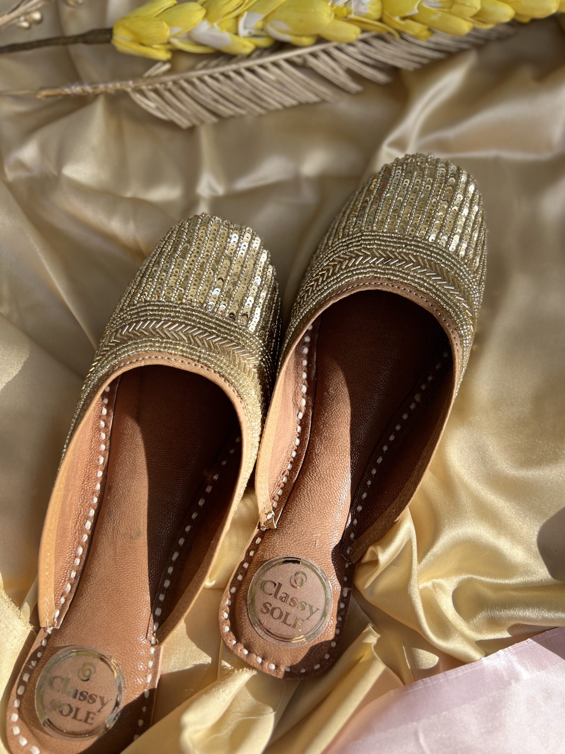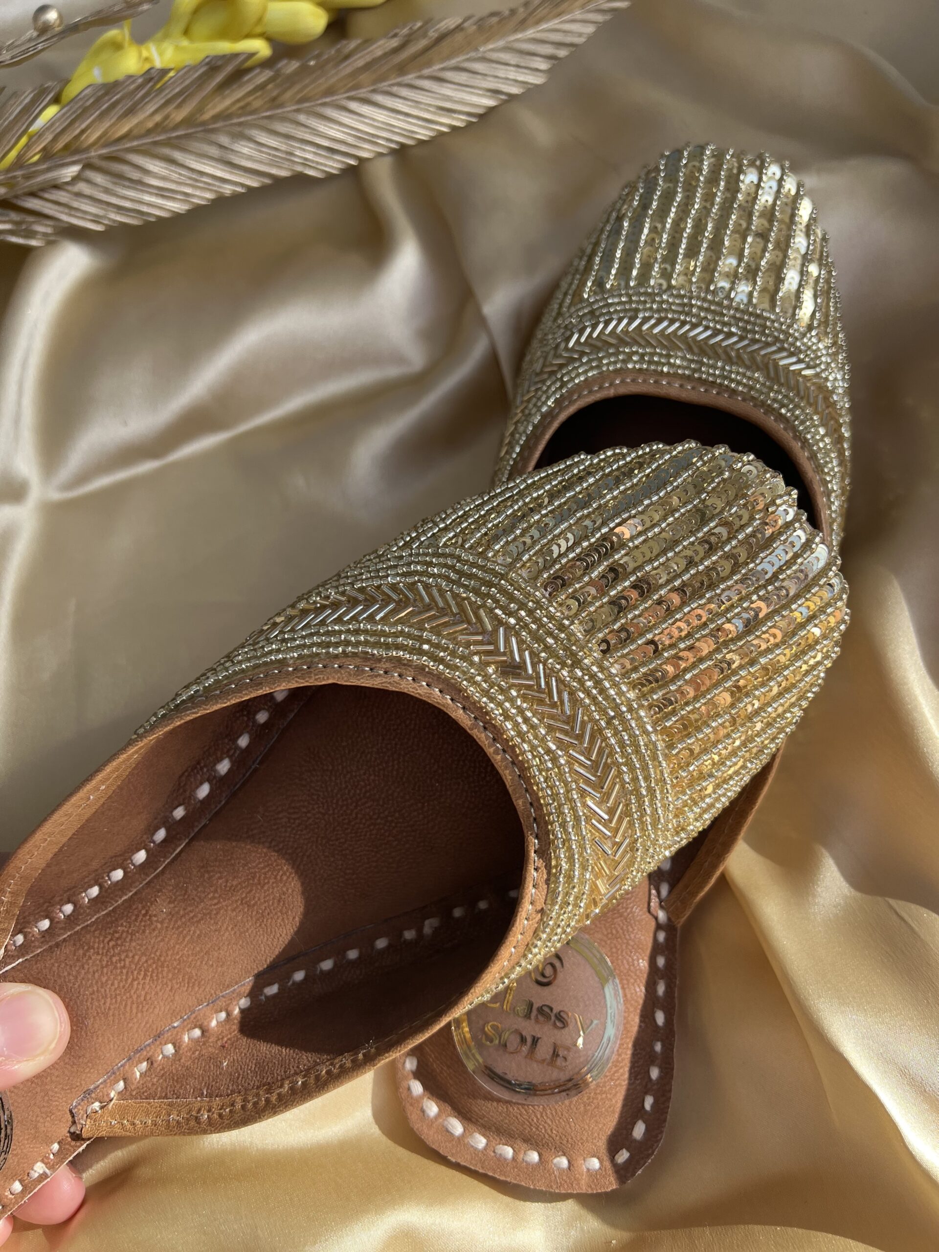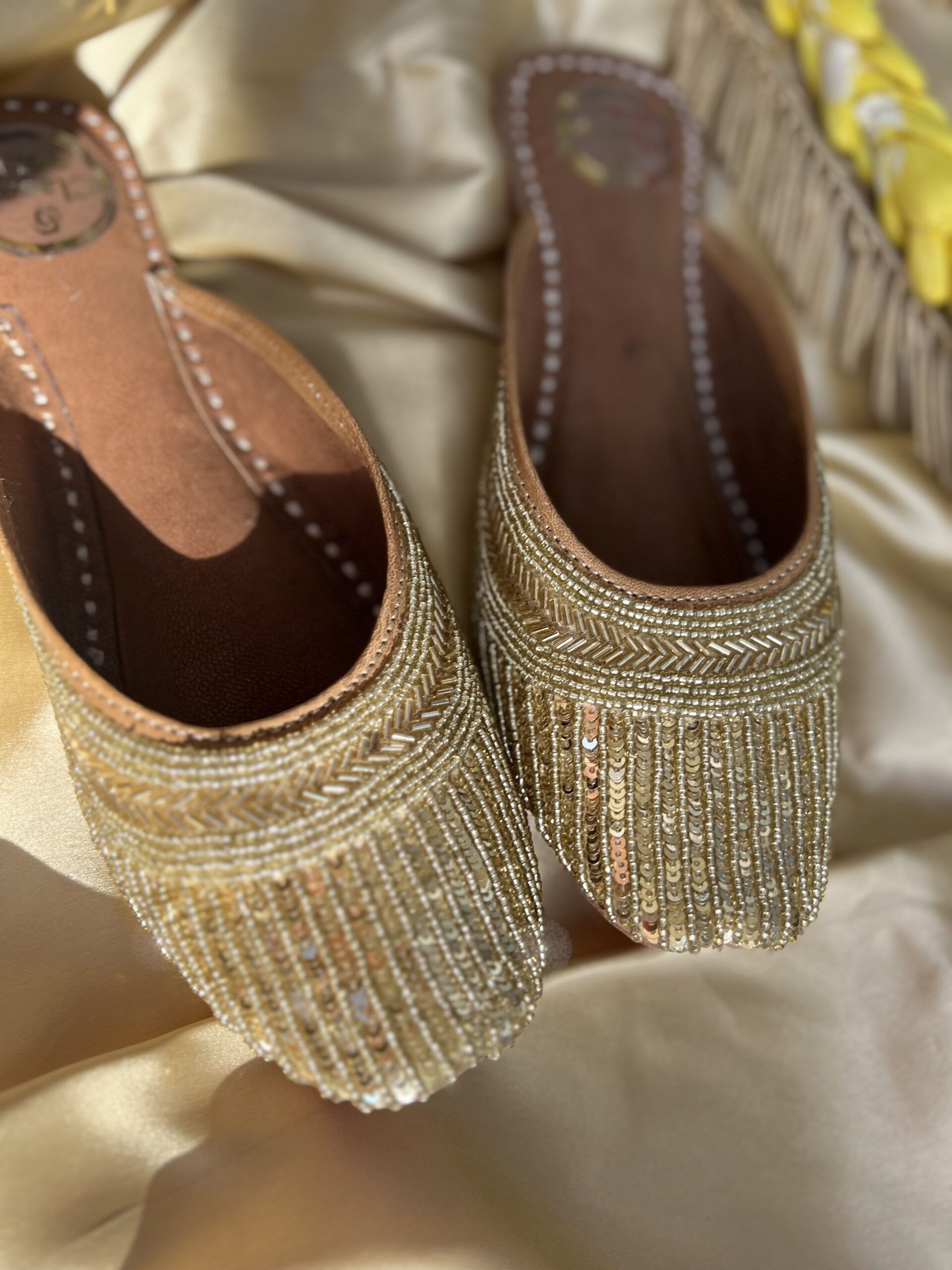 Introducing our glamorous Golden Sequence Work Juttis in a chic back-open style, designed to make you shine with every step. Handcrafted to perfection, each pair features intricate golden sequin work meticulously arranged to create a dazzling effect. The back-open design adds a contemporary twist, ensuring effortless slip-on wear without compromising on style. Crafted with a focus on comfort, these juttis boast a soft and cushioned sole, allowing you to dance the night away in absolute comfort. Whether you’re attending a festive celebration, a soirée, or simply want to add a touch of sparkle to your everyday ensemble, our Golden Sequence Work Juttis are the perfect choice. Elevate your look with unmatched elegance and glamour.