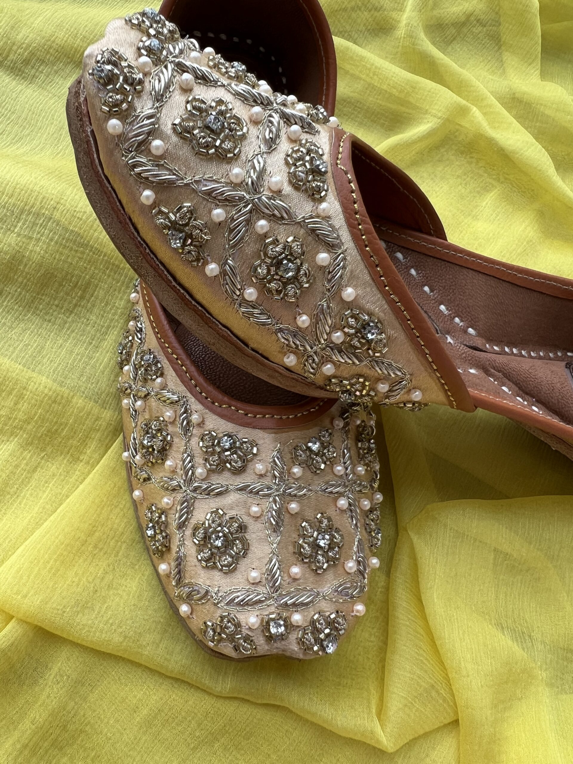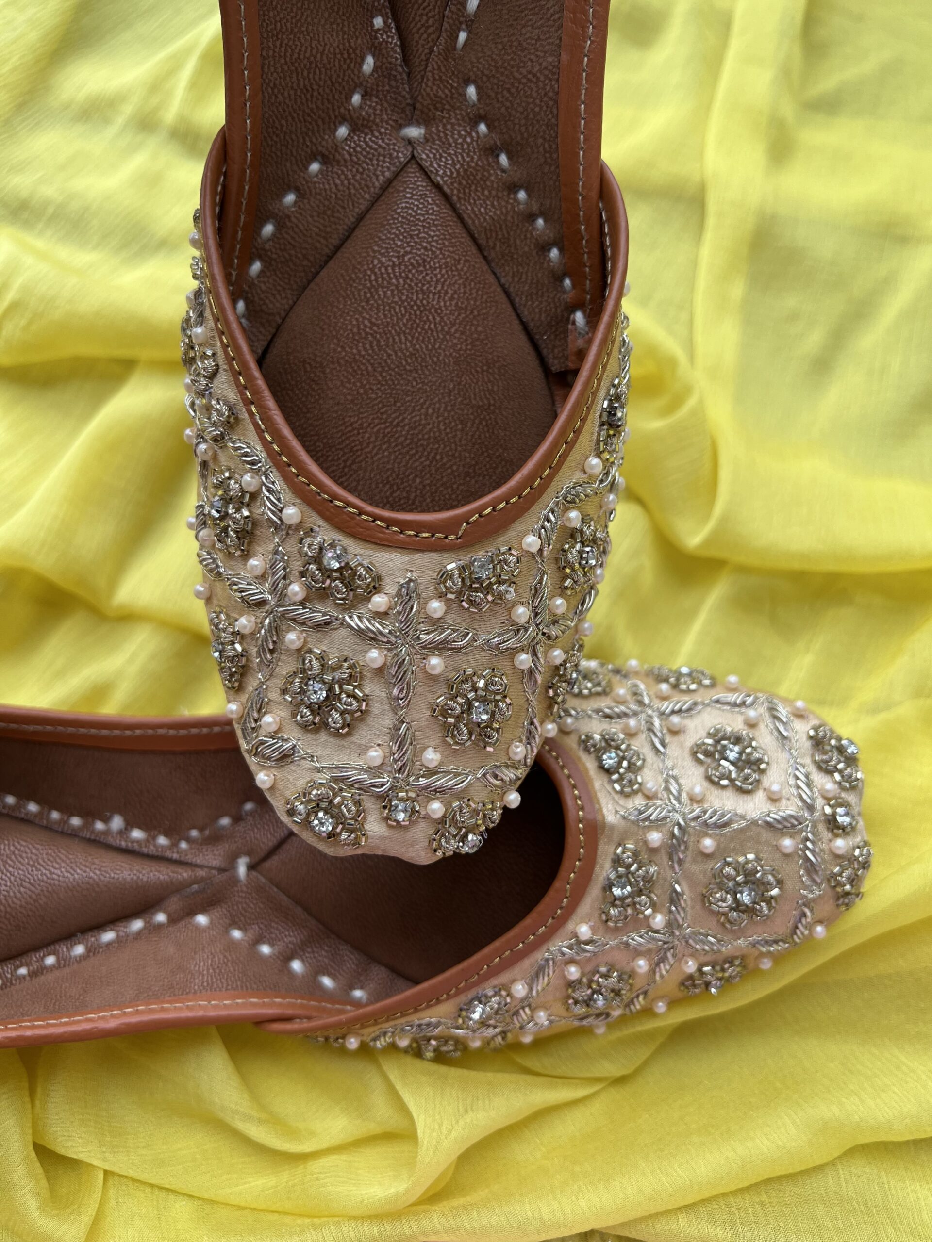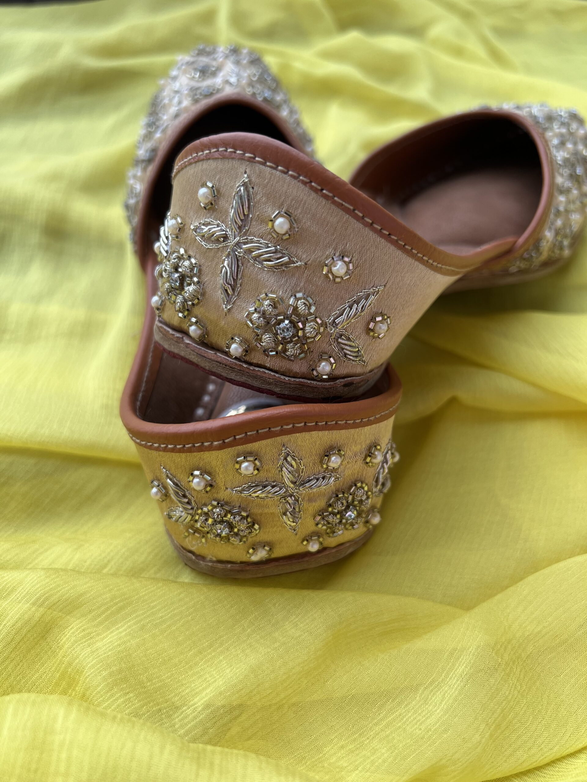 Introducing our exquisite Handmade Golden Jutti for women, a true blend of elegance and craftsmanship. Each pair is meticulously crafted by skilled artisans, ensuring unparalleled quality and attention to detail.